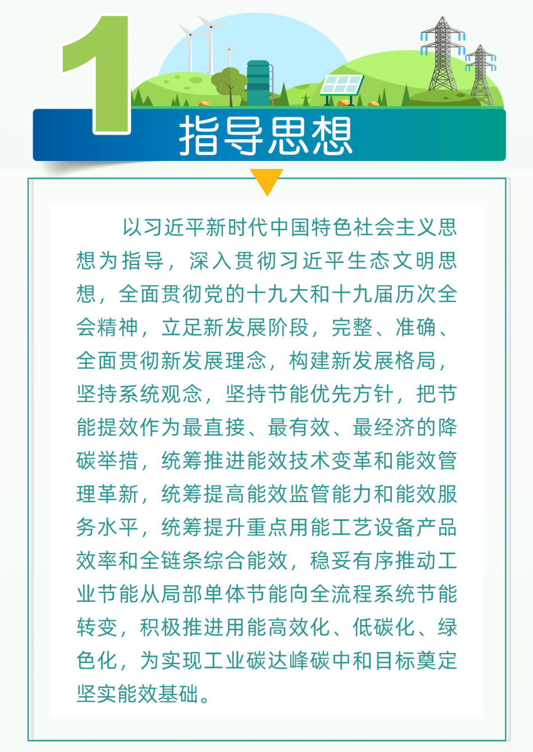 指導(dǎo)思想是以習(xí)近平新時(shí)代中國特色社會(huì)主義思想為指導(dǎo),深入貫徹習(xí)近平生態(tài)文明思想,全面貫徹黨的十九大和十九屆歷次全會(huì)精神,立足新發(fā)展階段,完整、準(zhǔn)確、全面貫徹新發(fā)展理念,構(gòu)建新發(fā)展格局,堅(jiān)持系統(tǒng)觀念,堅(jiān)持節(jié)能優(yōu)先方針,把節(jié)能提效作為最直接、最有效、最經(jīng)濟(jì)的降碳舉措,統(tǒng)籌推進(jìn)能效技術(shù)變革和能效管理革新,統(tǒng)籌提高能效監(jiān)管能力和能效服務(wù)水平,統(tǒng)籌提升重點(diǎn)用能工藝設(shè)備產(chǎn)品效率和全鏈條綜合能效,穩(wěn)妥有序推動(dòng)工業(yè)節(jié)能從局部單體節(jié)能向全流程系統(tǒng)節(jié)能轉(zhuǎn)變,積極推進(jìn)用能高效化、低碳化、綠色化,為實(shí)現(xiàn)工業(yè)碳達(dá)峰碳中和目標(biāo)奠定堅(jiān)實(shí)能效基礎(chǔ)。