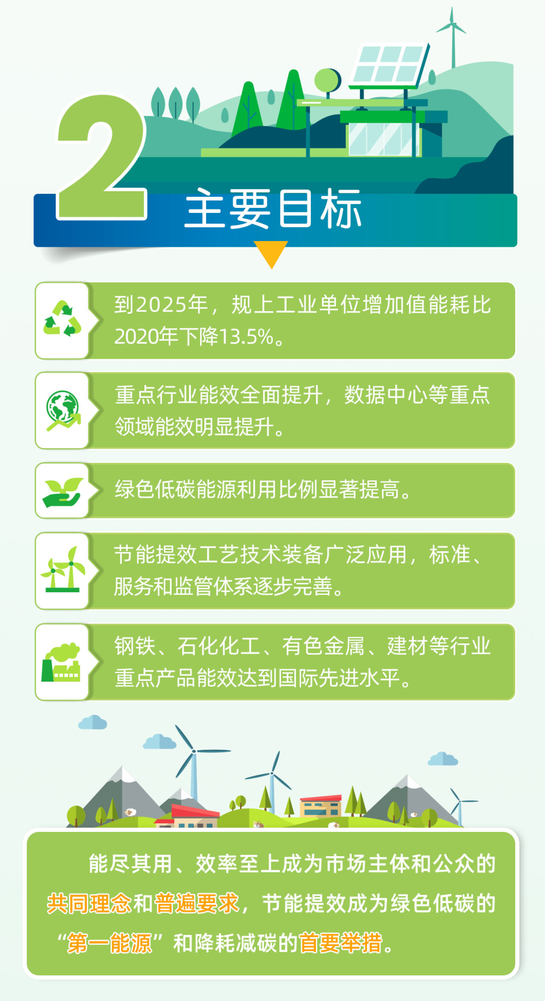 主要目標(biāo)是到2025年,重點(diǎn)工業(yè)行業(yè)能效全面提升,數(shù)據(jù)中心等重點(diǎn)領(lǐng)域能效明顯提升,綠色低碳能源利用比例顯著提高,節(jié)能提效工藝技術(shù)裝備廣泛應(yīng)用,標(biāo)準(zhǔn)、服務(wù)和監(jiān)管體系逐步完善,鋼鐵、石化化工、有色金屬、建材等行業(yè)重點(diǎn)產(chǎn)品能效達(dá)到國際先進(jìn)水平,規(guī)模以上工業(yè)單位增加值能耗比2020年下降13.5%。能盡其用、效率至上成為市場主體和公眾的共同理念和普遍要求,節(jié)能提效進(jìn)一步成為綠色低碳的“第一能源”和降耗減碳的首要舉措。同時(shí),結(jié)合產(chǎn)業(yè)發(fā)展實(shí)際提出一系列具體目標(biāo),到2025年,新增高效節(jié)能電機(jī)占比達(dá)到70%以上,新增高效節(jié)能變壓器占比達(dá)到80%以上,新建大型、超大型數(shù)據(jù)中心電能利用效率(pue)優(yōu)于1.3,工業(yè)領(lǐng)域電能占終端能源消費(fèi)比重達(dá)到30%。