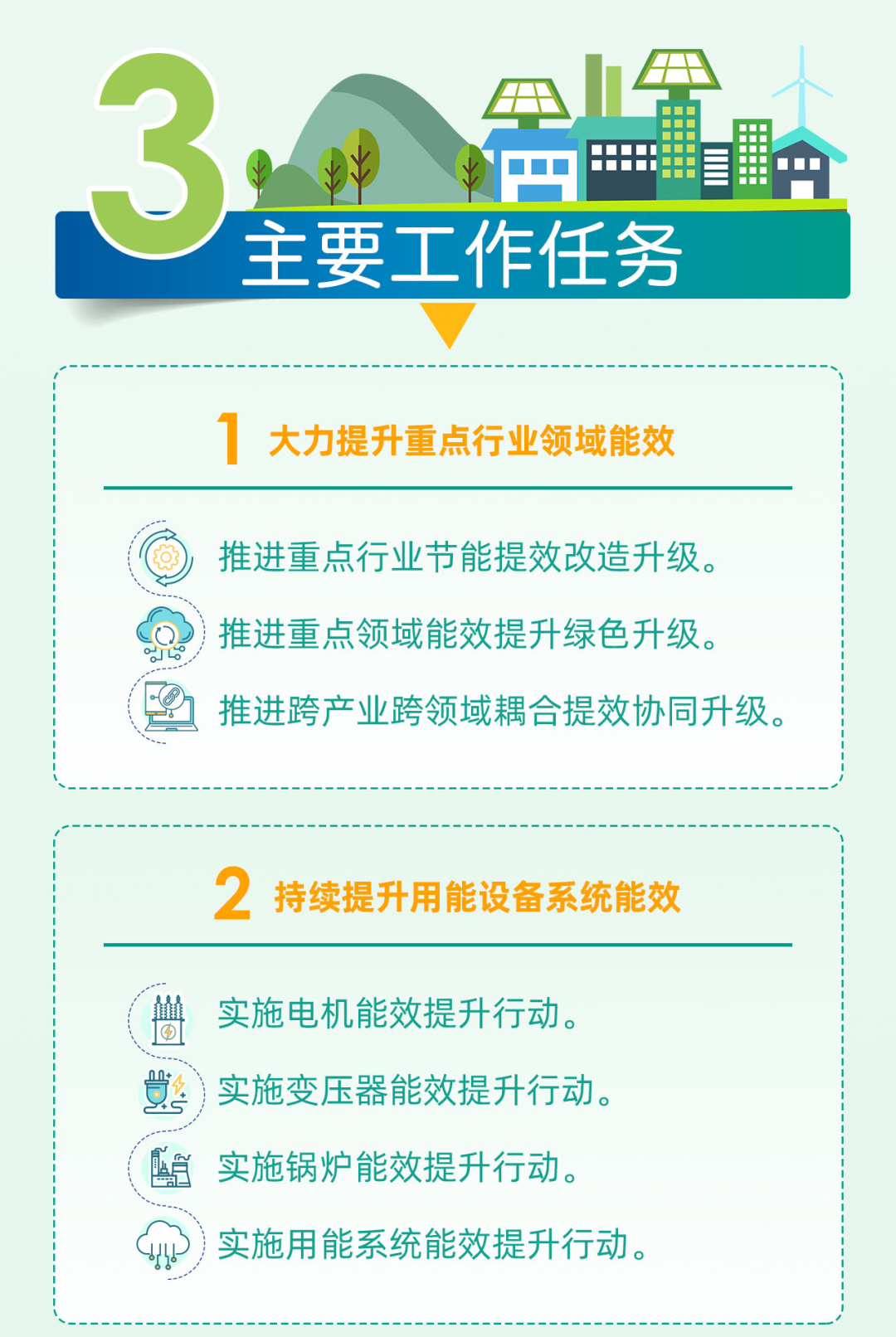 《行動(dòng)計(jì)劃》聚焦重點(diǎn)用能行業(yè)、重點(diǎn)用能領(lǐng)域和重點(diǎn)用能設(shè)備,分業(yè)施策,分類推進(jìn),系統(tǒng)提升工業(yè)能效水平;加強(qiáng)全鏈條、全維度、全過程用能管理,強(qiáng)化標(biāo)準(zhǔn)引領(lǐng)和節(jié)能服務(wù),協(xié)同提升大中小企業(yè)、工業(yè)園區(qū)能效水平;統(tǒng)籌優(yōu)化工業(yè)用能結(jié)構(gòu)、數(shù)字賦能等對節(jié)能提效的促進(jìn)作用,全面提升工業(yè)能效基礎(chǔ)。具體提出7個(gè)方面任務(wù):