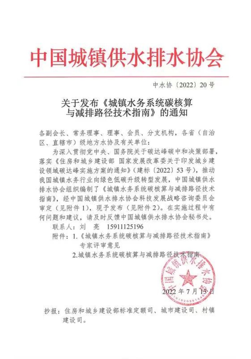 為深入貫徹黨中央、國務院關于碳達峰碳中和決策部署,落實《住房和城鄉(xiāng)建設部 國家發(fā)展改革委關于印發(fā)城鄉(xiāng)建設領域碳達峰實施方案的通知》(建標〔2022〕53號),推動我國城鎮(zhèn)水務行業(yè)向綠色低碳升級轉型發(fā)展,中國城鎮(zhèn)供水排水協(xié)會(以下簡稱中國水協(xié))組織北京建筑大學、北京首創(chuàng)生態(tài)環(huán)保集團股份有限公司、北京城市排水集團有限責任公司、中建環(huán)能科技股份有限公司、中國市政工程中南設計研究總院有限公司、哈爾濱工業(yè)大學等單位編制了《城鎮(zhèn)水務系統(tǒng)碳核算與減排路徑技術指南》(以下簡稱指南),現(xiàn)予發(fā)布。