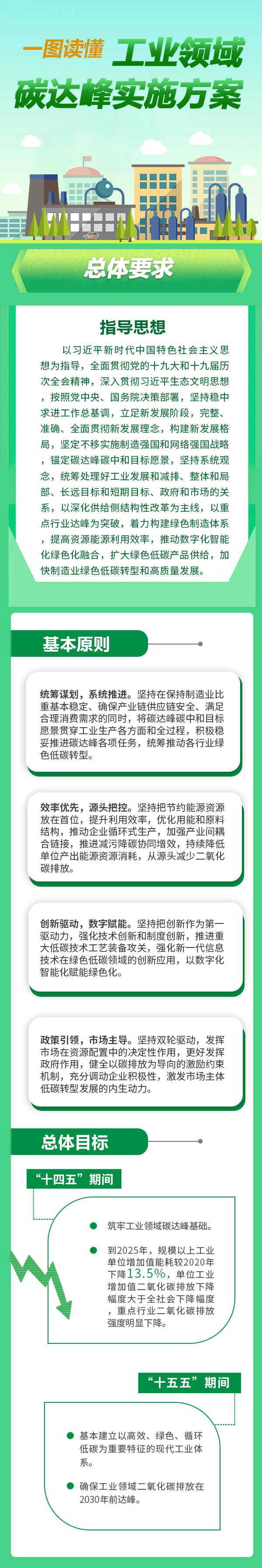 工業(yè)和信息化部、國家發(fā)展改革委、生態(tài)環(huán)境部印發(fā)《工業(yè)領(lǐng)域碳達峰實施方案》(以下簡稱《方案》),其中提出,“十四五”期間,產(chǎn)業(yè)結(jié)構(gòu)與用能結(jié)構(gòu)優(yōu)化取得積極進展,能源資源利用效率大幅提升,建成一批綠色工廠和綠色工業(yè)園區(qū),研發(fā)、示范、推廣一批減排效果顯著的低碳零碳負碳技術(shù)工藝裝備產(chǎn)品,筑牢工業(yè)領(lǐng)域碳達峰基礎(chǔ)。